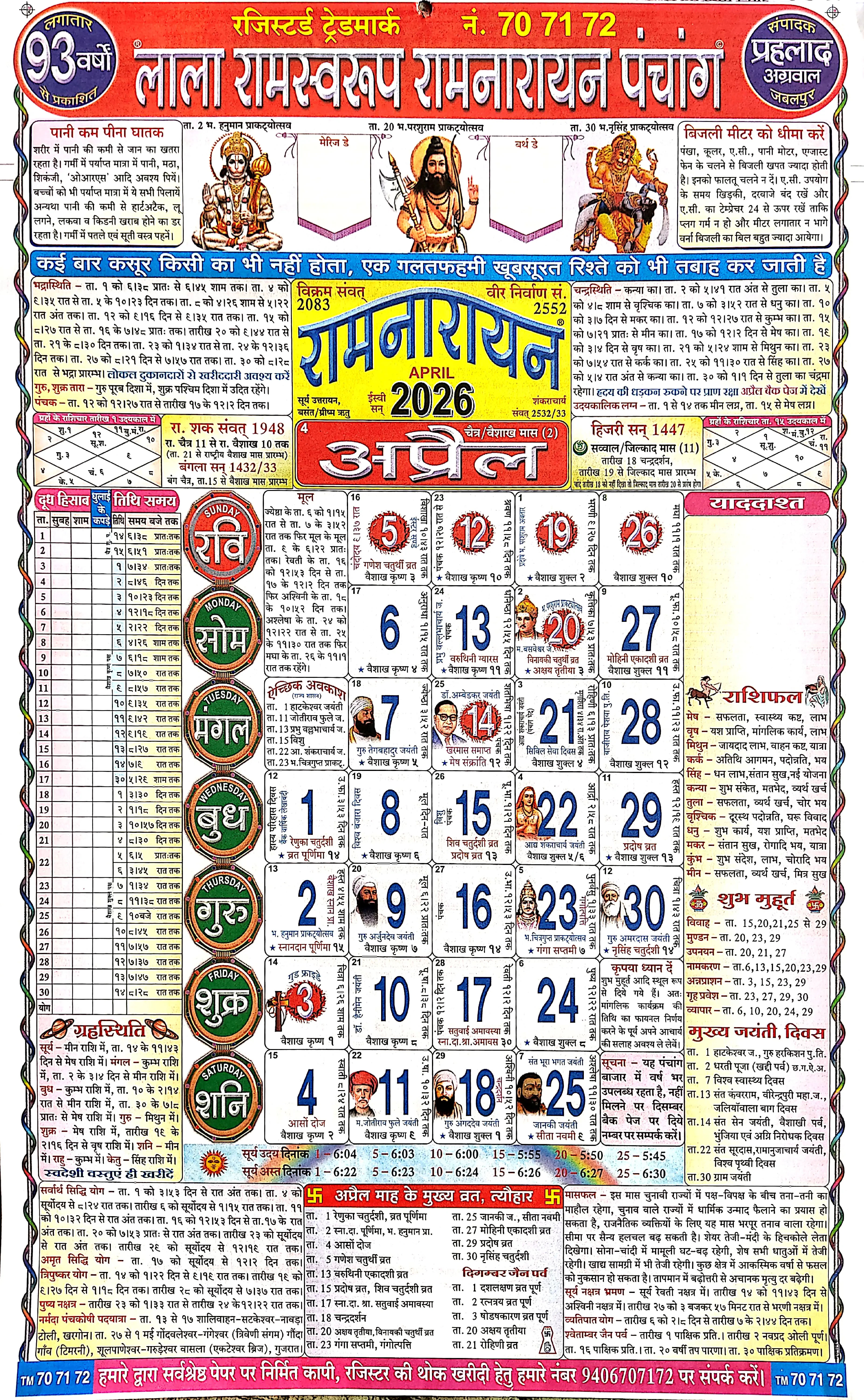 लाला रामस्वरूप पंचांग अप्रैल 2026 हमें यह याद दिलाता है कि जीवन में संघर्ष (हनुमान जी) और सफलता (अक्षय तृतीया) दोनों का महत्व है। हनुमान जयंती की भक्ति और अक्षय तृतीया की समृद्धि का यह संगम हमारे आने वाले समय को खुशहाली से भर देता है।