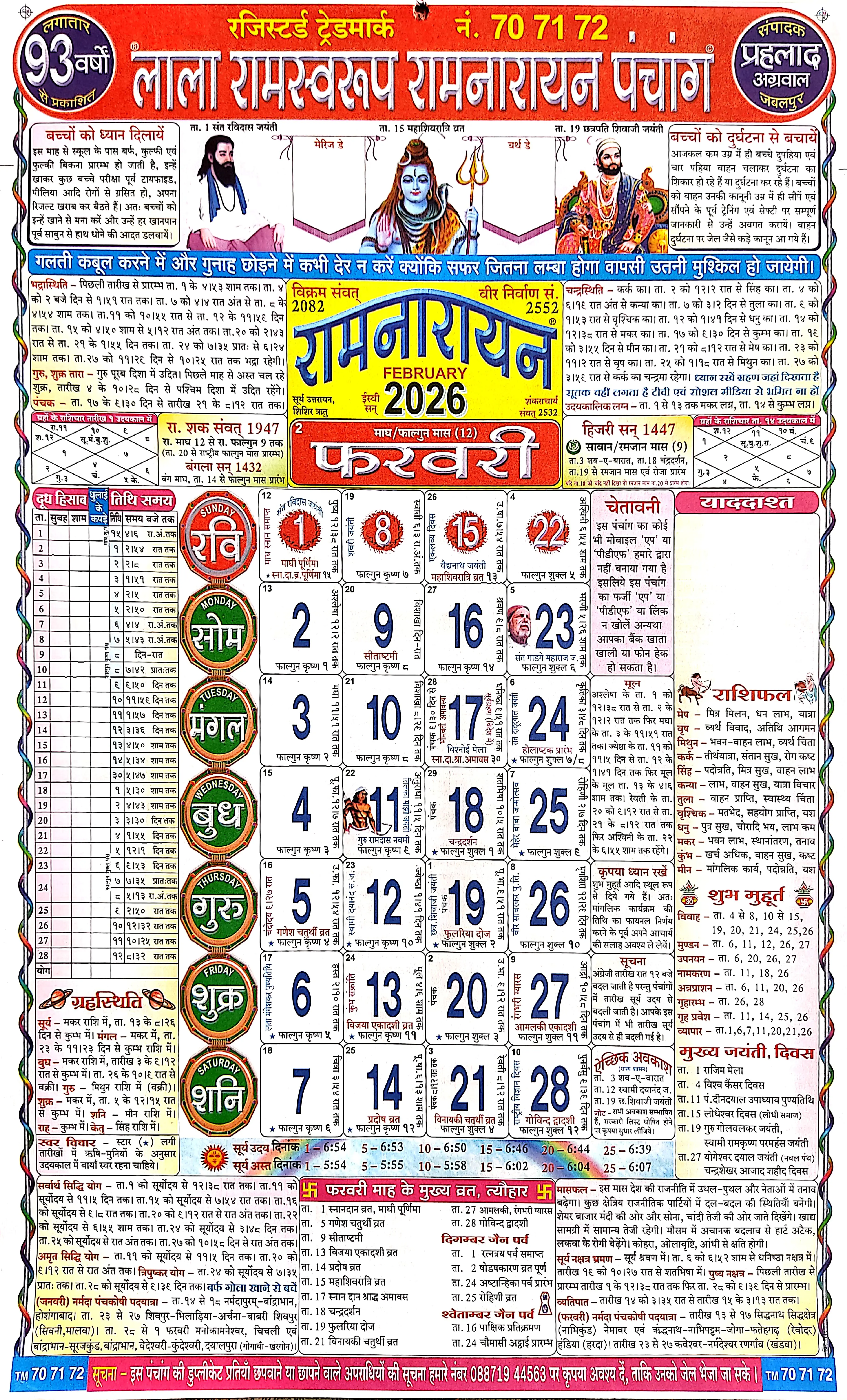 लाला रामस्वरूप पंचांग फरवरी 2026 हमें यह याद दिलाता है कि जीवन में उत्सव और अनुशासन (व्रत) दोनों का होना आवश्यक है। महाशिवरात्रि की पावन रात से लेकर संत रविदास की शिक्षाओं तक, यह महीना हमें अध्यात्म की गहराई में ले जाता है।