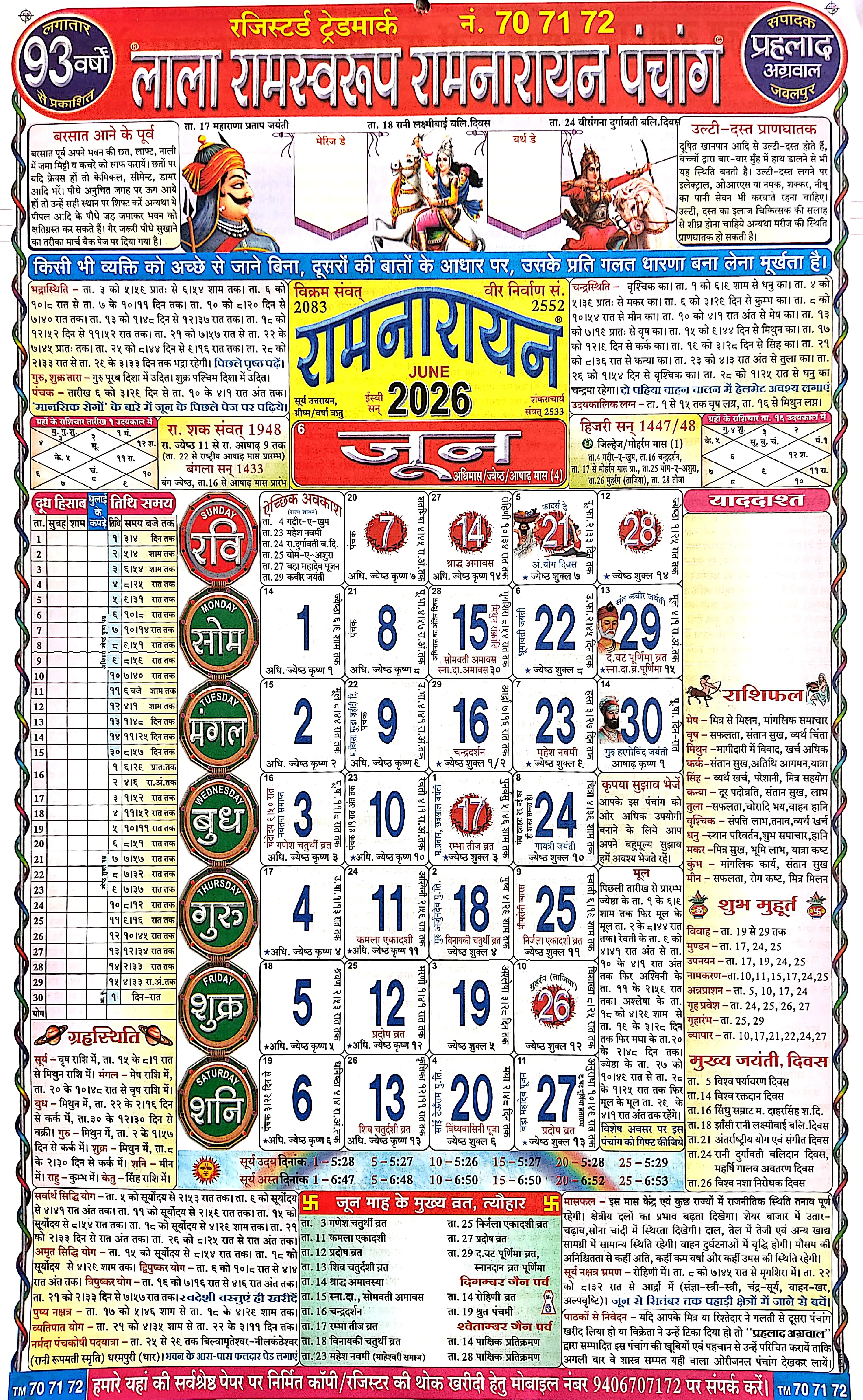 मुहूर्त की वापसी: 15 जून की रात के बाद से शुभ मुहूर्त फिर से खुलेंगे। 16 जून से लेकर 30 जून के बीच आप नए कार्यों की योजना बना सकते हैं। 25 जून (निर्जला एकादशी) का दिन भी दान और संकल्प के लिए बहुत शुभ है। विस्तृत जानकारी के लिए लाला रामस्वरूप पंचांग जून 2026 के पन्नों को देखें।