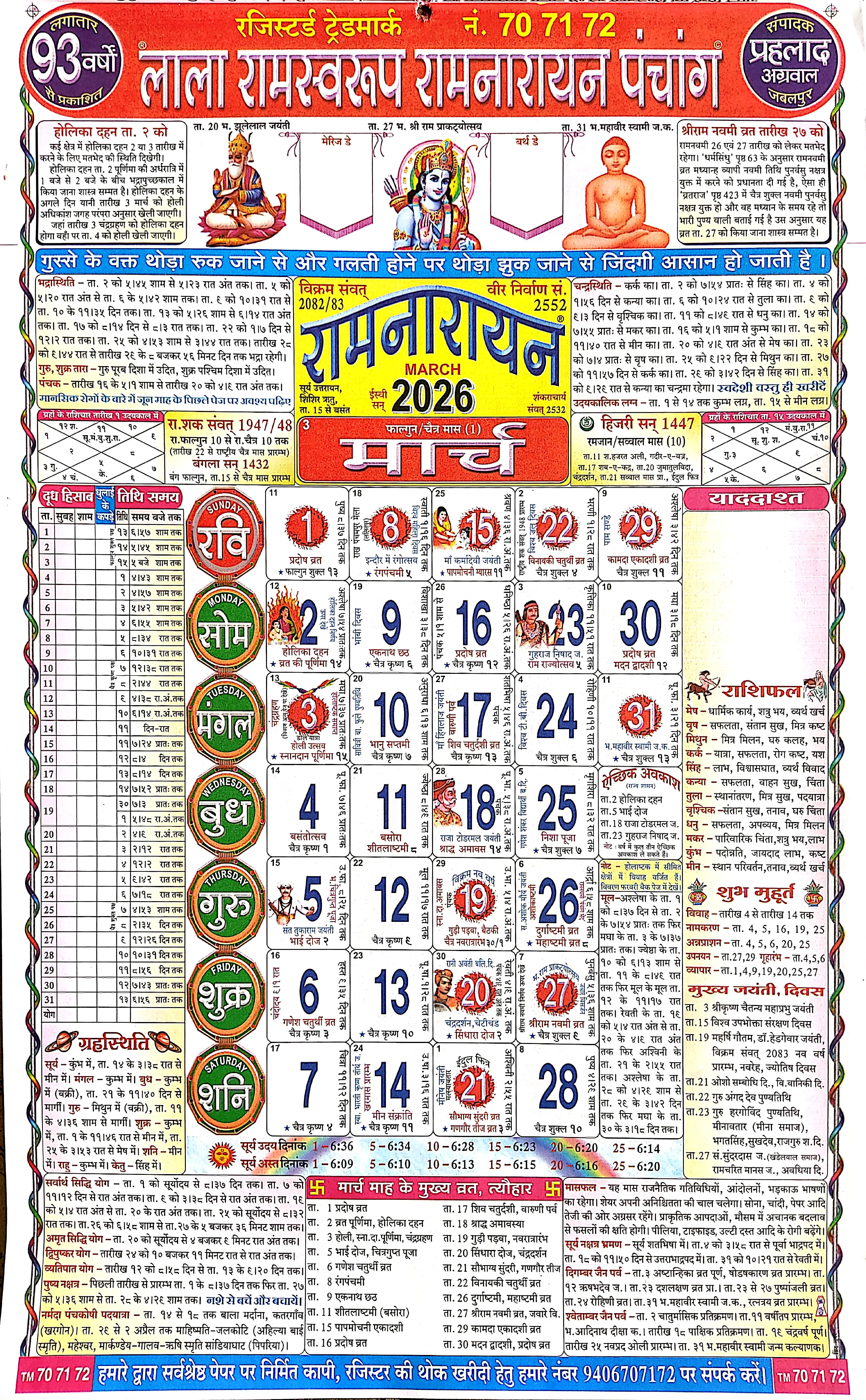 रंगों की फुहार, चैत्र की सुहानी सुबह और हिंदू नववर्ष (Vikram Samvat 2083) का मंगलमय आगमन—मार्च 2026 का महीना भारतीय संस्कृति के सबसे बड़े उत्सवों का साक्षी बनने जा रहा है। लाला रामस्वरूप कैलेंडर (Lala Ramswaroop Calendar) के अनुसार, मार्च का महीना भक्ति और आनंद का ऐसा संगम है जहाँ ‘फाल्गुन’ की मस्ती होली के रंगों में घुलती है और ‘चैत्र’ की पवित्रता नवरात्रि के रूप में घर-घर में शक्ति का संचार करती है।
