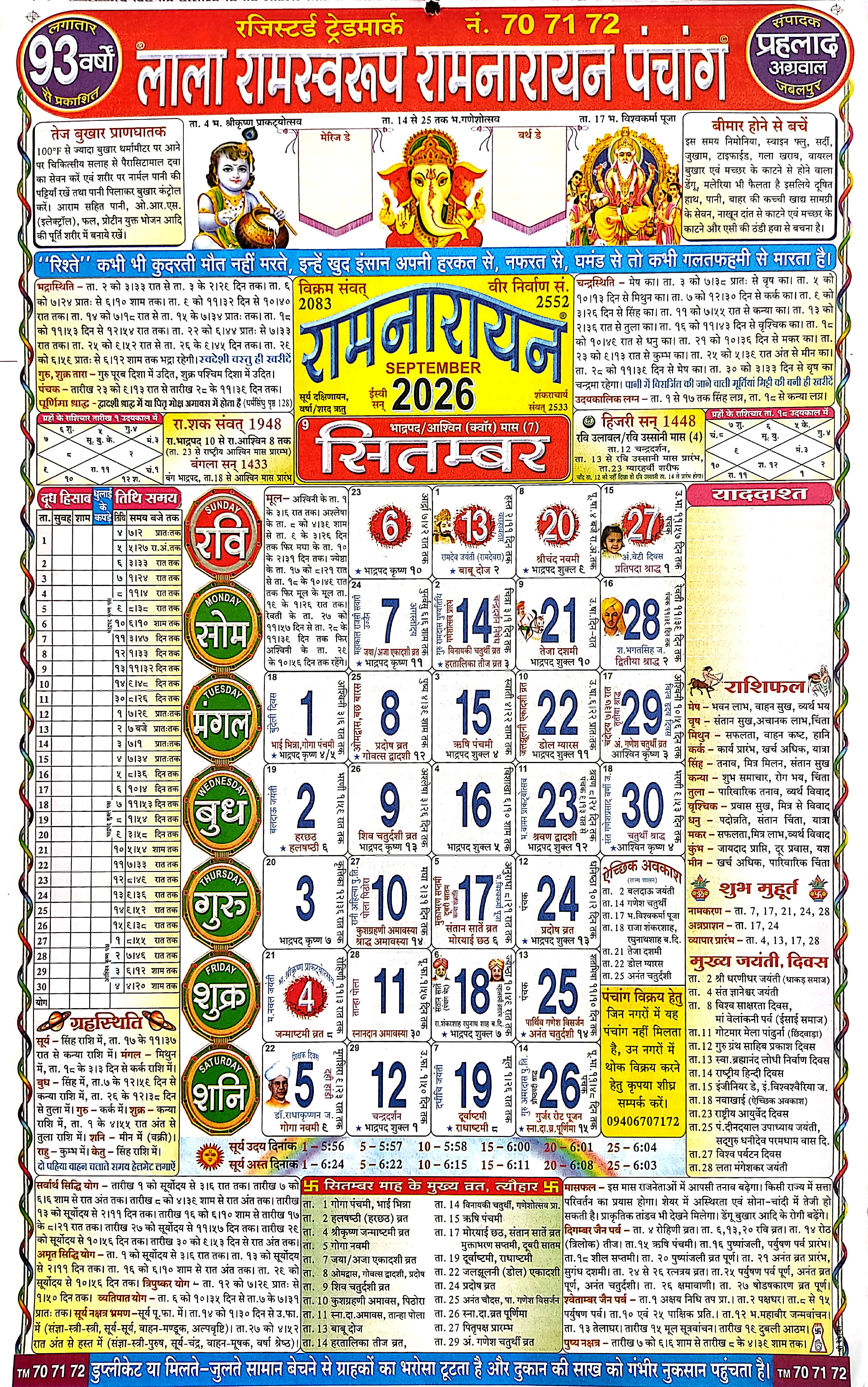 लाला रामस्वरूप पंचांग सितंबर 2026